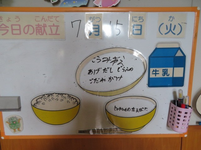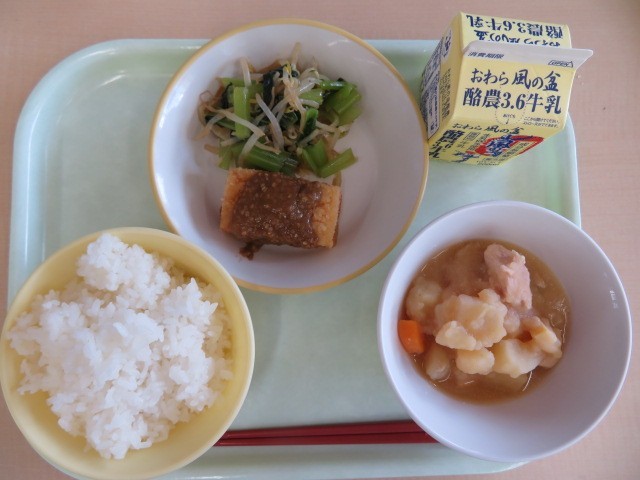 今日の献立は、ご飯、牛乳、揚げ出し豆腐のごまだれかけ、香味和え、じゃがいもの南蛮煮です。