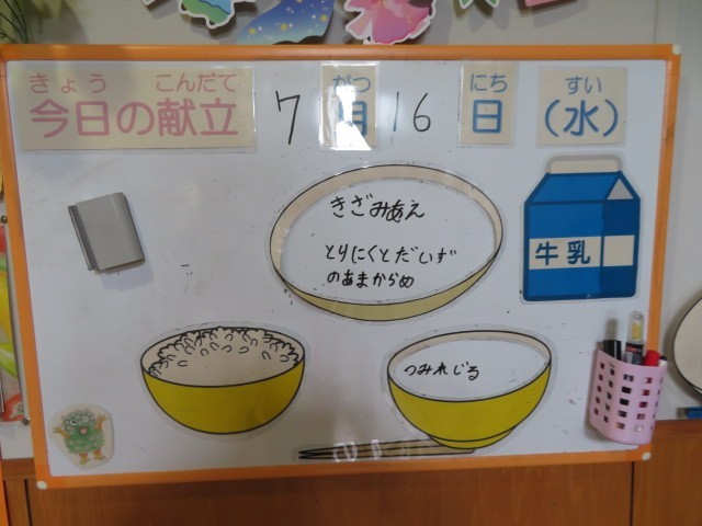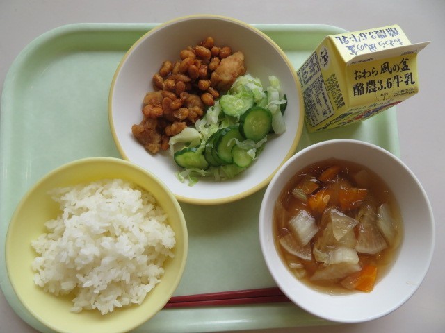 今日の献立は、ご飯、牛乳、鶏肉と大豆の甘からめ、きざみ和え、つみれ汁です。