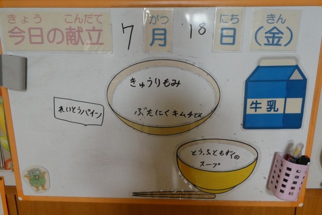 今日の献立は、牛乳、豚肉キムチ丼、きゅうりもみ、豆腐ともずくのスープ、冷凍パインです。