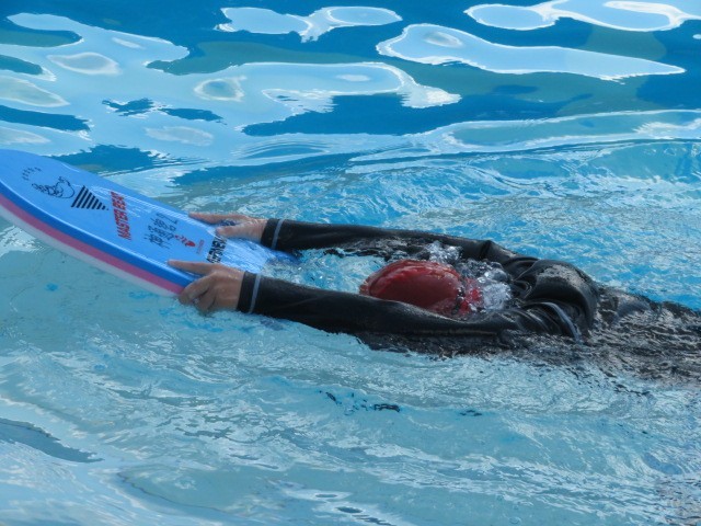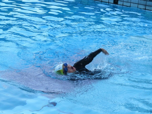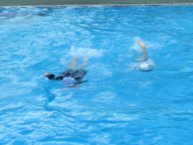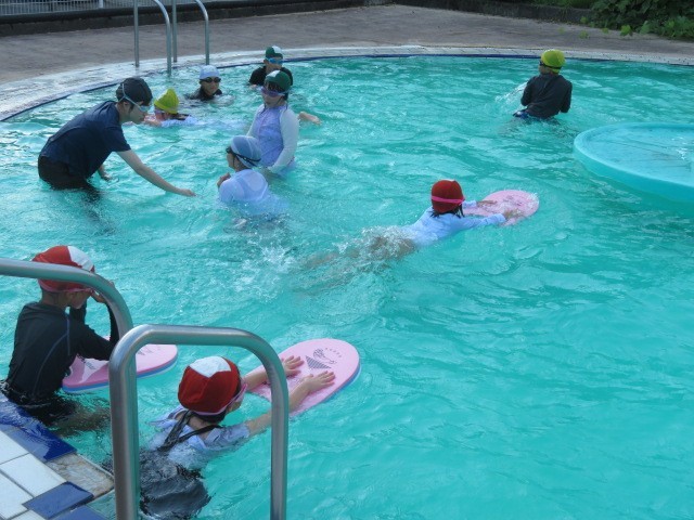 今まで各チームで学習してきましたが、子供たちの上達ぶりには目を見張るものがあります。水に顔をつけることができるようになった子、だるまうきやけのびが上達した子、ビート板を使って12.5メートルぐらい泳げるようになった子、クロールで50メートル程度泳げるようになった子等、38人それぞれが自分の力を高めることができた水泳学習になりました。