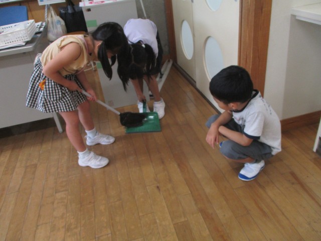 今日は教室をきれいにしたり、自由研究や夏休みの話を聞きあったりしました。