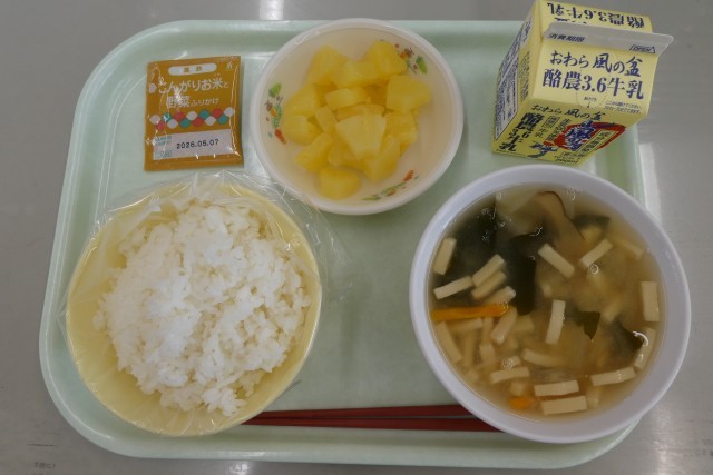 今日の献立は、セルフおにぎり、牛乳、高野豆腐のみそ汁、パインの缶詰、野菜ふりかけです。