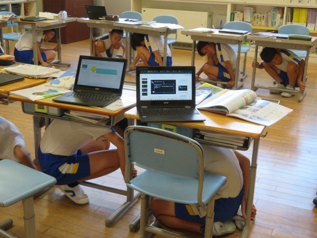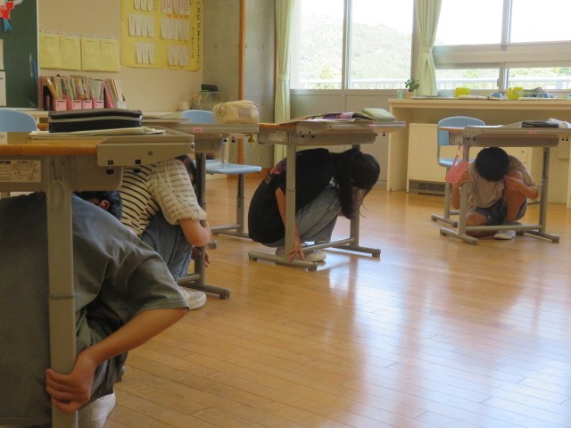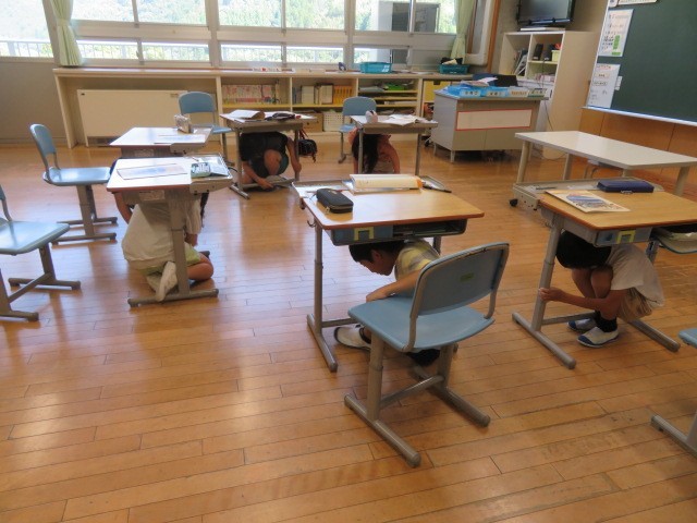 9月1日(月) シェイクアウト訓練 公開日 2025/09/02 更新日 2025/09/01 学校行事 今日、9月1日は防災の日です。そして、今日は「県民一斉防災訓練~シェイクアウトとやま 2025~ 富山が揺れても、心は動じない」を通じて、防災に関する意識を高める日でもあります。 「まず低く(しゃがんで)」「頭を守り(隠れて)」「動かない(じっとして)」の3要領に従って、身を守る行動をとります。碧っ子も机の下に隠れ、自分の身を守る行動を実施しました。 +1