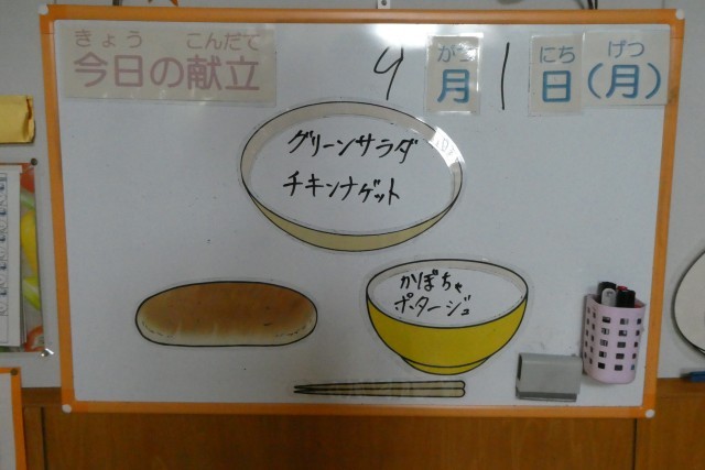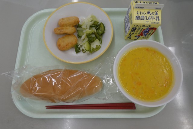 今日の献立は、コッペパン、牛乳、チキンナゲット、グリーンサラダ、かぼちゃポタージュです。