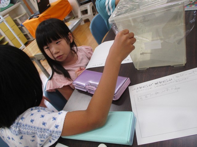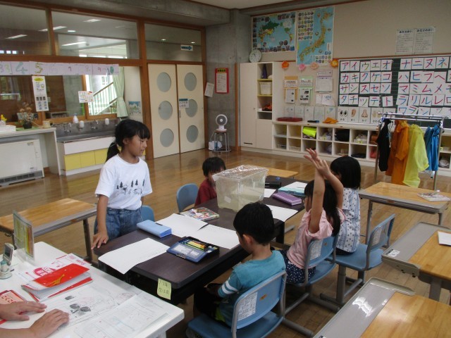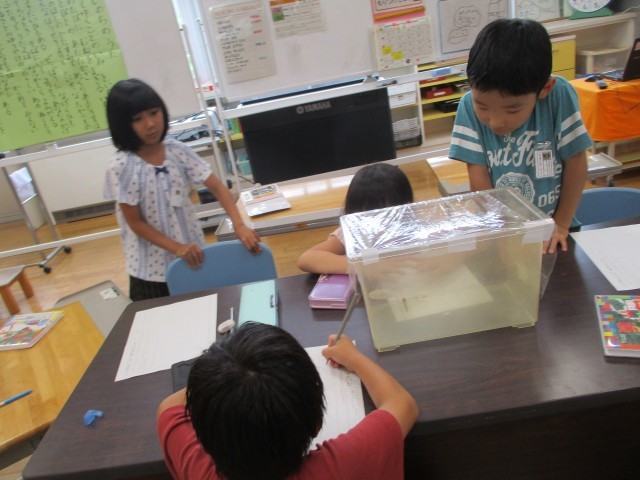 1年生は、生活科の時間に見つけたトンボを、よく見てスケッチしていました。仲良しになったトンボですが、ここにずっと置いておくというわけにはいかない、逃がしてあげたほうが楽に飛べる…などトンボの身になって考えている子供たちの姿がすてきでした。