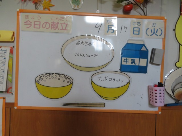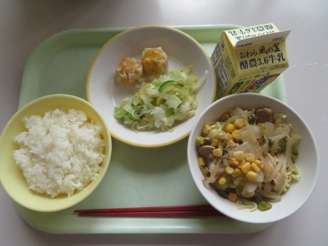 今日の献立は、ご飯、牛乳、にんじんシューマイ、あわせ和え、サッポロラーメンです。