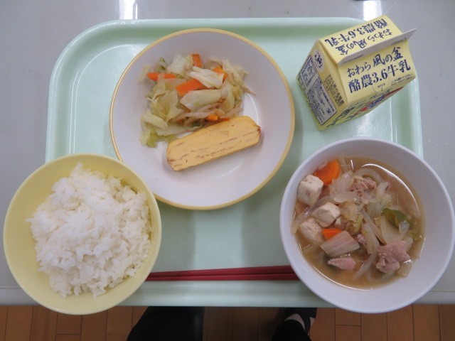 今日の献立は、ご飯、牛乳、厚焼き卵、野菜ソテー、肉豆腐です。