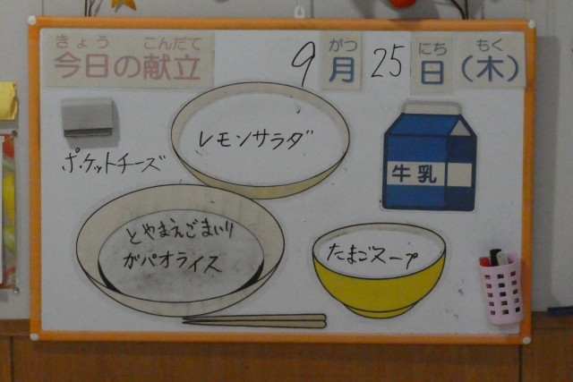 9月25日(木) 今日の給食 公開日 2025/09/25 更新日 2025/09/25 職員室より 今日の献立は、ごはん、牛乳、とやまのえごま入りガパオライス、レモンサラダ、卵スープ、ポケットチーズです。