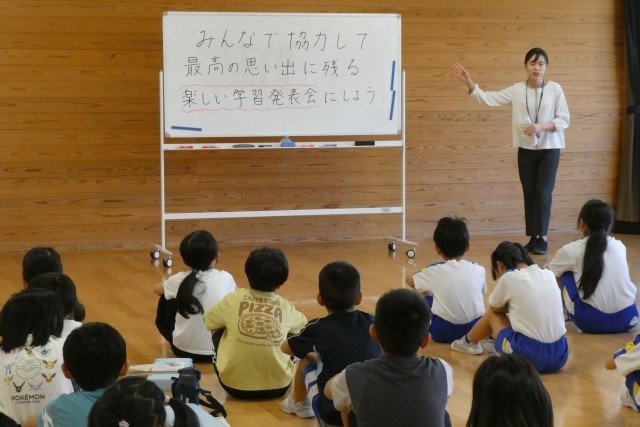スローガンは「みんなで協力して 最高の思い出に残る 楽しい学習発表会にしよう」です。