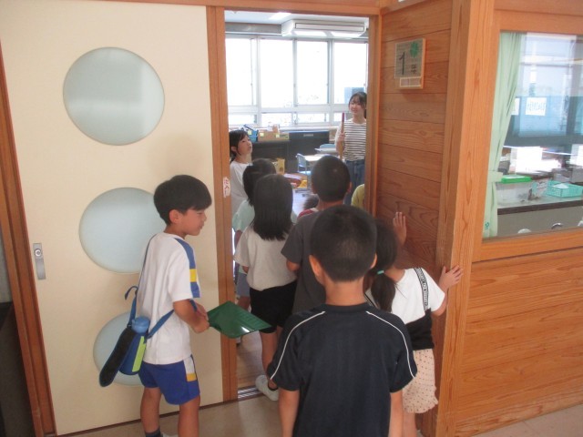 初めて神通碧小学校にやって来た船峅っ子に、碧っ子が案内しました。教室やテラス、図書館等、子供たちが説明しながら紹介していきます。