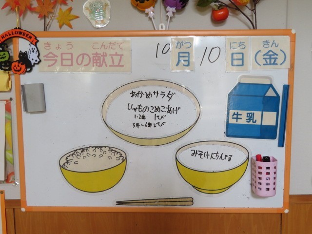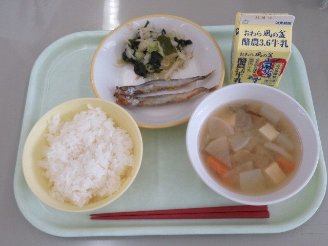 今日の献立は、ごはん、牛乳、ししゃもの米粉揚げ、わかめサラダ、みそけんちん汁です。