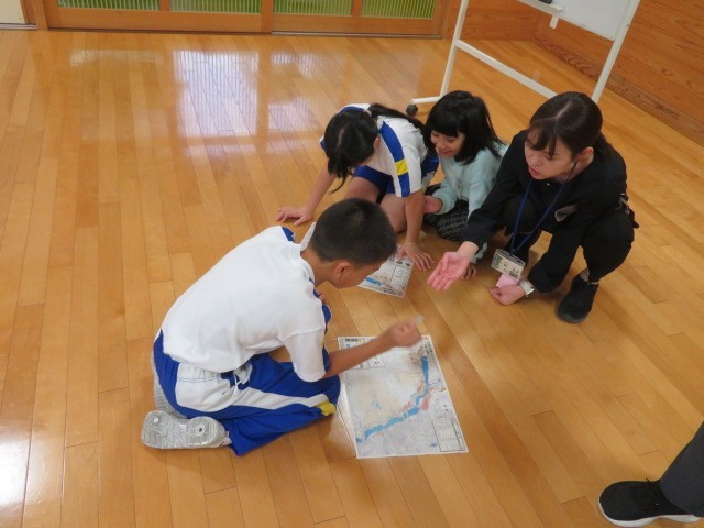 歌の練習後に、「ハザードマップの確認」を行いました。防災主任から話を聞き、自分の地区(自分の家)の土砂災害の危険性を知り、地図に自宅のシールを貼ることで可視化しました。