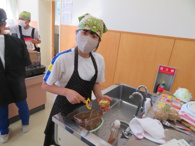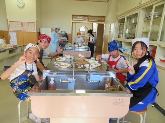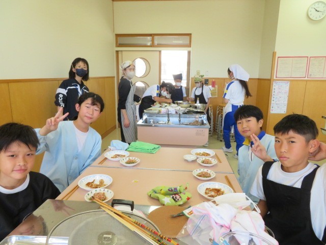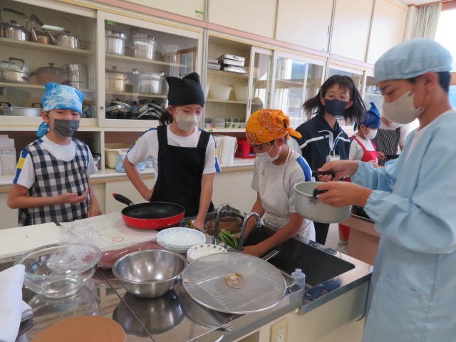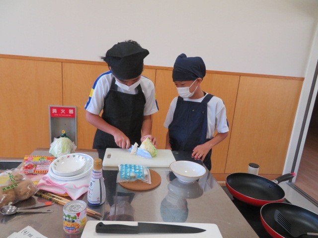 10月15日(水) 5・6年生 家庭科(調理実習) 公開日 2025/10/15 更新日 2025/10/15 5年生の部屋 今日の5・6年生の家庭科は、「主催と副菜」をつくりました。5年生3名のグループに、6年生1名が入り、実習計画を立てたものです。 調理実習が初めての5年生。その5年生を温かく見守り、分かりやすく教える6年生が頼もしく見えました。どのグループも満足そうに、料理を味わっていました。 +2
