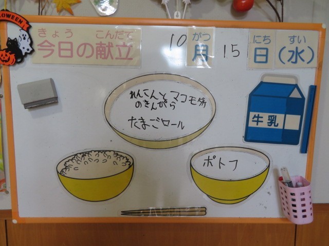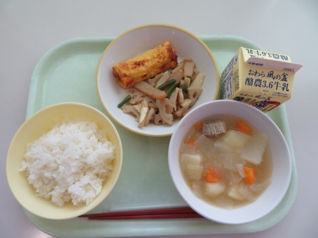 今日の献立は、ご飯、牛乳、卵ロール、れんこんとまこもだけのきんぴら、ポトフです。