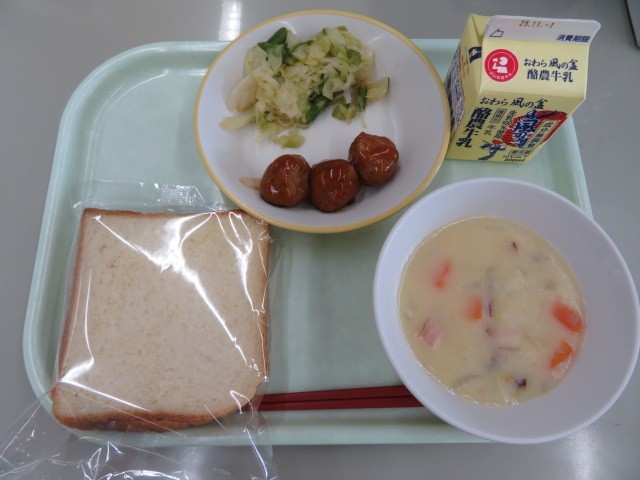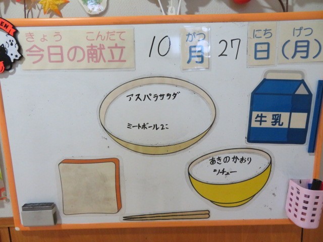 今日の献立は、食パン、牛乳、アスパラサラダ、ミートボール、秋の香りシチューです。