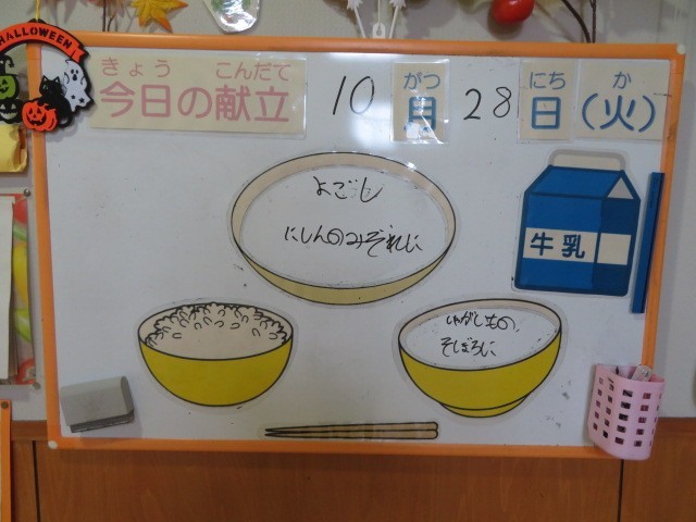今日の献立は、ご飯、牛乳、にしんのみぞれ煮、よごし、じゃがいものそぼろ煮です。