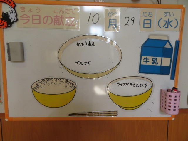 今日の献立は、ご飯、牛乳、プルコギ、華風和え、中華かきたま汁です。