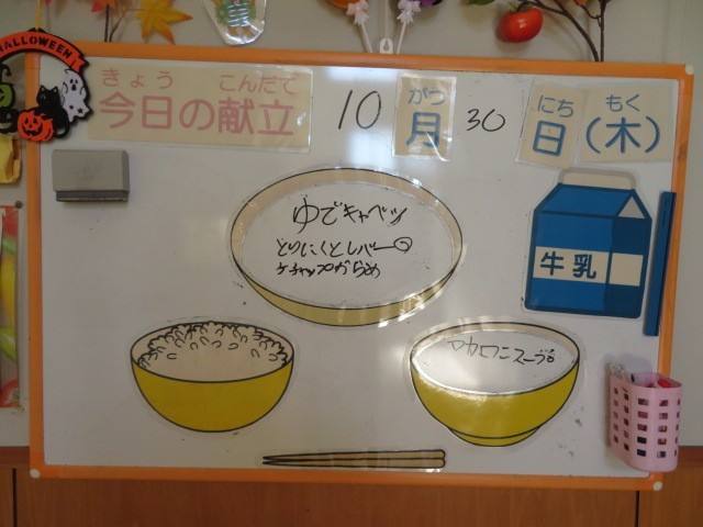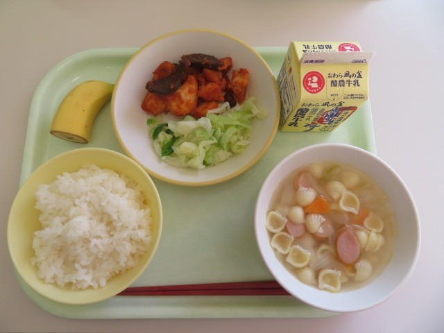 10月30日(木) 今日の献立 公開日 2025/11/01 更新日 2025/10/30 職員室より 今日の献立は、ご飯、牛乳、鶏肉とレバーのケチャップからめ、ゆでキャベツ、マカロニスープ、バナナです。