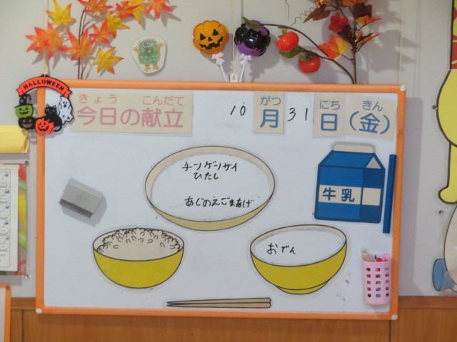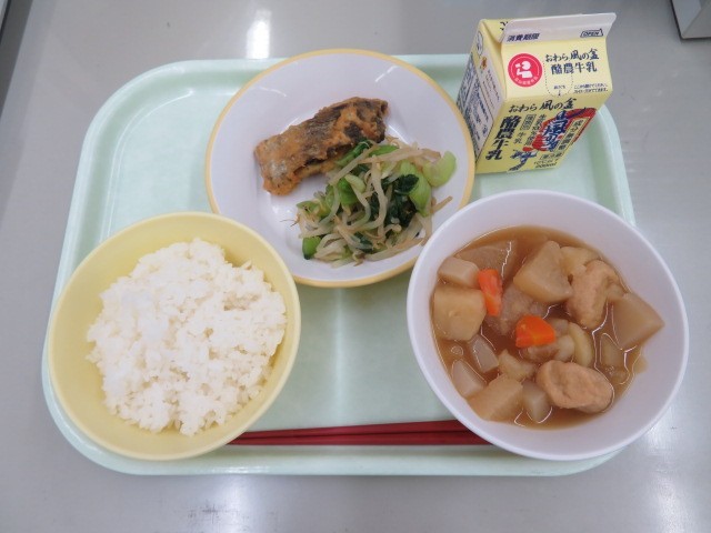 今日の献立は、ごはん、牛乳、あじのえごま揚げ、チンゲンサイひたし、おでんです。