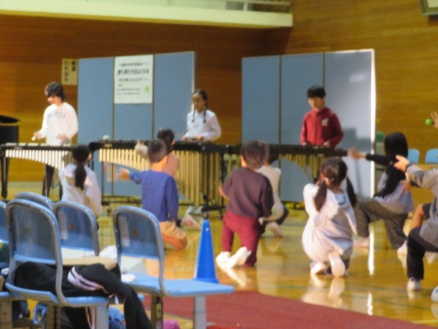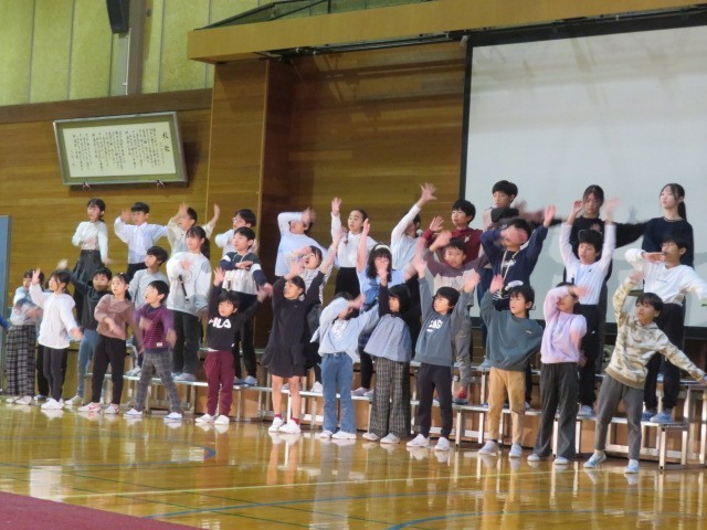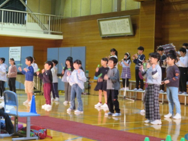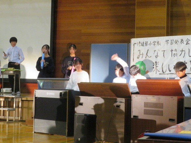 小学校全校音楽発表は、合唱「いのちの歌」「未来が生まれてる」、合奏「茶色の小びん」の3曲でした。合唱では、これまで曲のよさが伝わるように歌い方や身体の使い方をいろいろ考えて練習をしてきました。これまでで一番素敵な歌声が響いていたのではないかと思います。合奏「茶色の小びん」では、碧っ子全員がいろいろな楽器を担当し素敵な音色を奏でたり、ダンスで曲を盛り上げたりしました。見てくださった方から盛大な拍手を頂きうれしそうな碧っ子の笑顔が素敵でした。