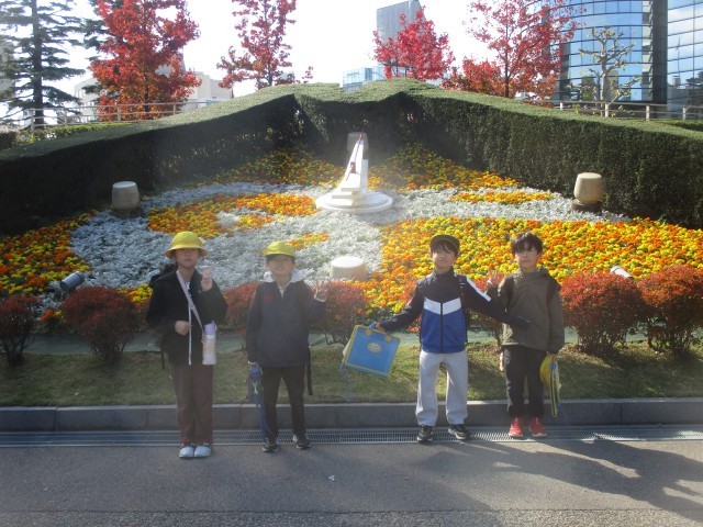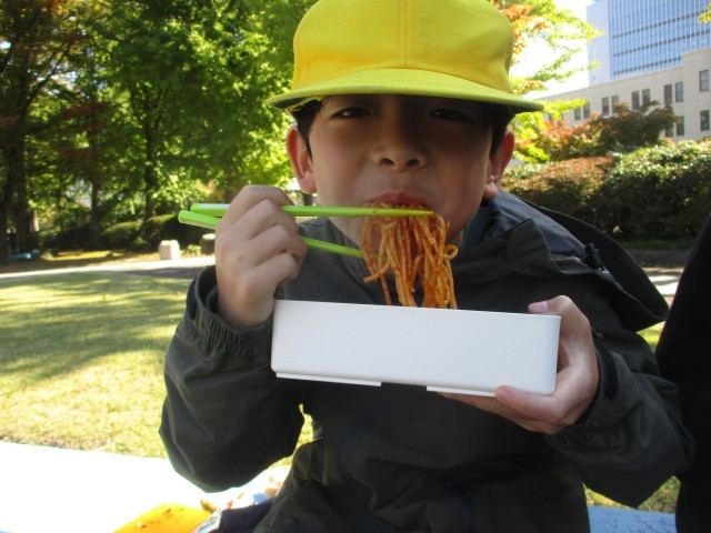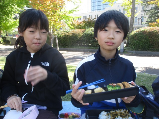 警察本部の見学後、県庁前公園で昼食をとりました。「お腹空いた」と口にしていた子供たちは準備してもらったお弁当をおいしそうに食べていました。
