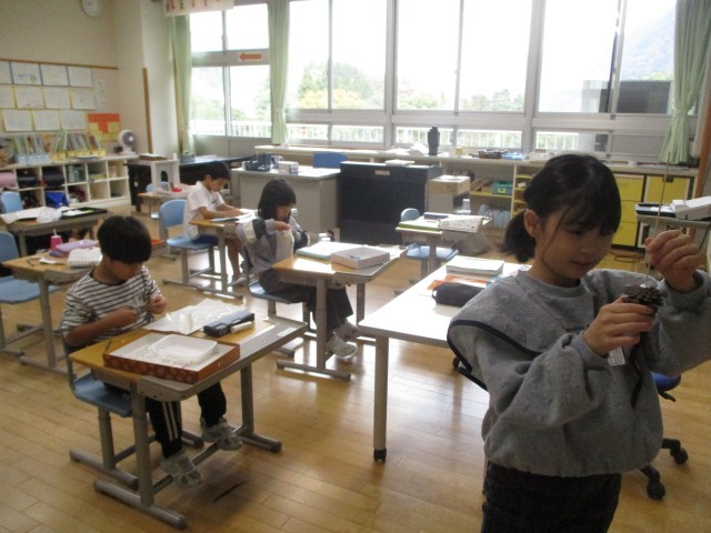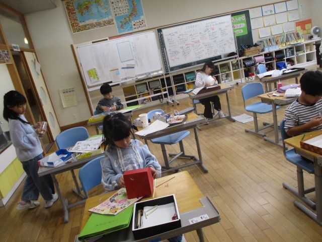 生活科の学習で、1・2年生はいろいろな材料を集めて、おもちゃを作っています。楽しいアイディアで作り進める1年生。作り進めては改良する2年生。みんなが楽しめるおもちゃ作りを目指しているようです。