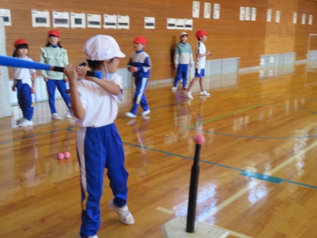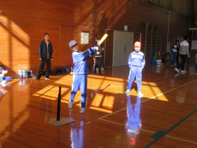 まず始めに、ペアになってキャッチボールです。投げ方やバウンドしたボールのとり方を教わりました。次に、ティーボールのティースタンドを使って、ボールの打ち方を練習しました。最後は、学んだことを生かして、全員でティーポールゲームです。低学年や中学年はベースボール型の方法を学びながら楽しそうにゲームを行っていました。高学年は、今までの体育の学習を生かし、思い切り打ったりボールを受けたりとチームとしての動きを考えて活動する姿が見られました。中には、ホームランを打つ子もいて、大いに盛り上がりました。ご指導ありがとうございました。