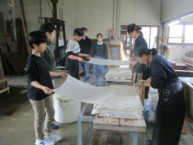 午後から親子活動として、八尾町の「桂樹舎」で紙漉き体験をしました。職人さんの説明を聞いた後に、作業に挑戦してみると「道具に水が入ると重たい!」「水の中は冷たい!」と初めての体験に難しさを感じていました。和紙の原料について質問をする児童もおり、ミツマタという天然の材料を使って和紙ができていることに驚いていました。今回製作した和紙は、卒業証書となり、来年の3月に子供たちの手に渡る予定です。