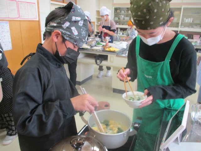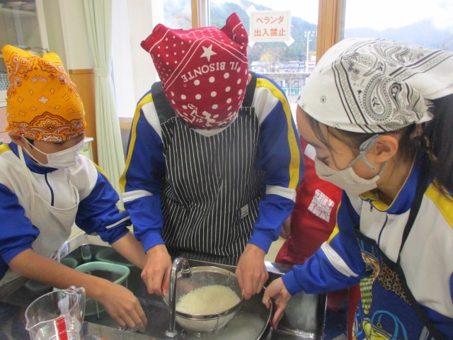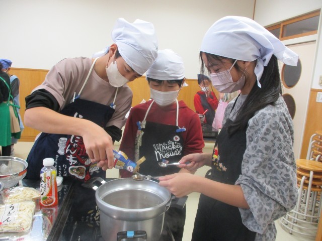 5・6年生の家庭科の学習の様子です。5年生はご飯とみそ汁作り、6年生はうどん作りに挑戦しました。決められた時間で手際よく調理をするために、野菜を切る人、皿洗いをする人など役割を決め、協力して調理することができました。