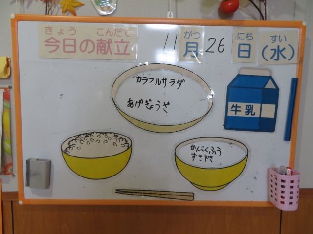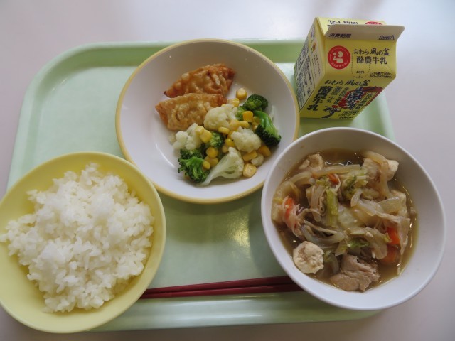 今日の献立は、ご飯、牛乳、揚げぎょうざ、カラフルサラダ、韓国風すきやきです。