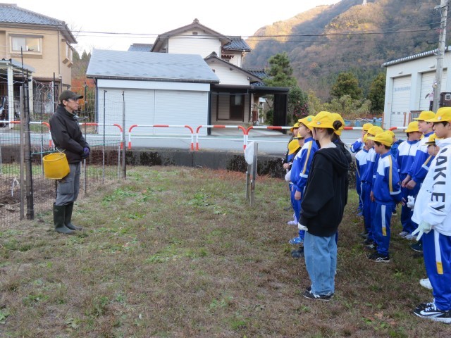ねいの里の赤座さんと百瀬さんの指導や協力のもと、4~6年生が電気柵の撤去作業を行いました。結束バンドを切り、支えの棒を外し、ネットや金網をまとめていきました。この電気柵のおかげで、農園の作物は被害にあっていません。子供たちは感謝の気持ちを込めて、黙々と片付けました。もちろん、来年もたくさんの野菜が大きく育ちますようにという願いも込めて。