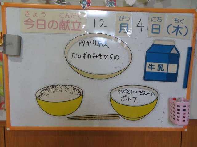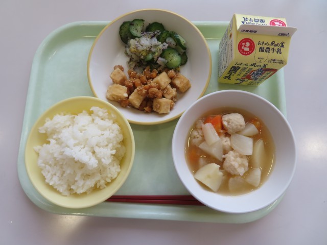 今日の献立は、ご飯、牛乳、大豆のみそからめ、ゆかり和え、かぶと肉団子のポトフです。