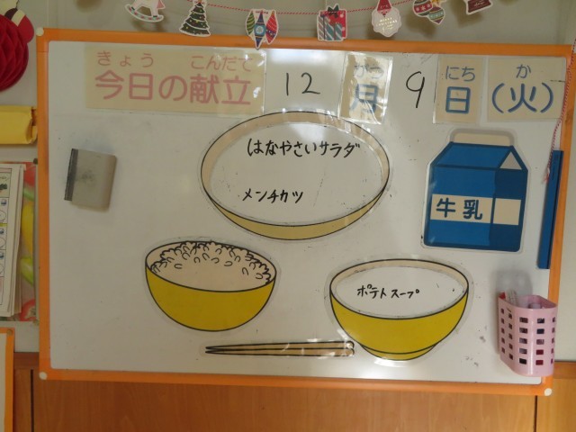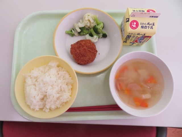 今日の献立は、ご飯、牛乳、メンチカツ、花野菜サラダ、ポテトスープです。