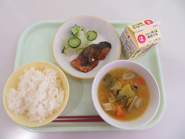 今日の献立は、ご飯、牛乳、ふくらぎの照焼き、柚子あえ、ほうとう鍋です。