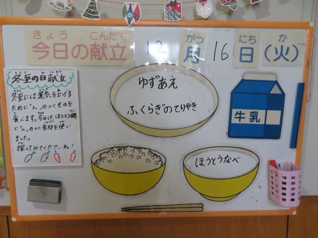 12月22日は冬至の日です。今日は一足早く、冬至の日献立となっています。
