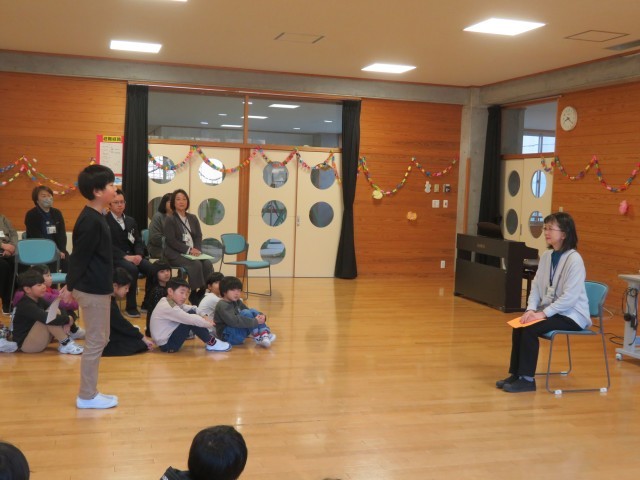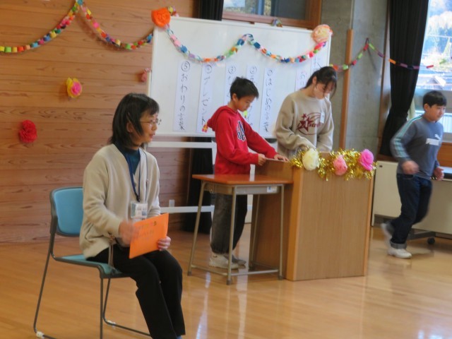 今日は、6年生が企画し、5・6年生で運営する「ありがとう集会」を行いました。一番長く時間を過ごすことのできた6年生の代表が思いを込めて、初めの言葉を述べました。