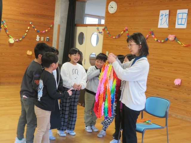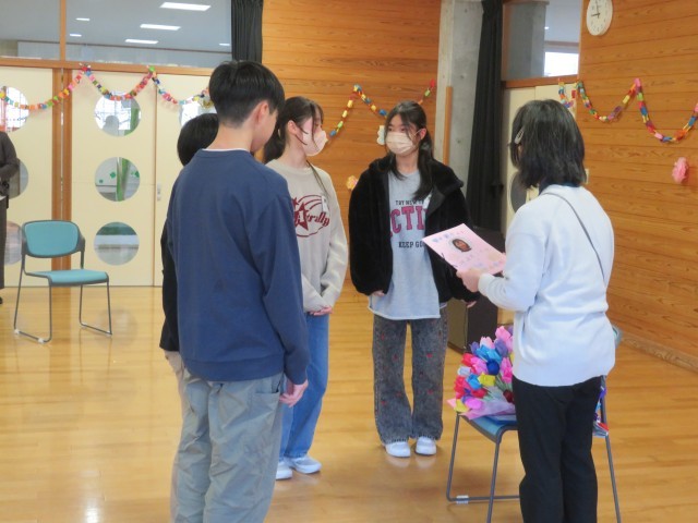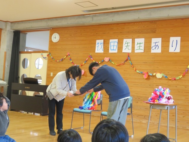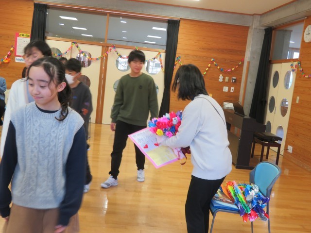 プレゼントを渡す時間になると、各学年の工夫されたプレゼントや温かいメッセージが届けられました。持ちきれないほどのプレゼントに、今までの感謝の気持ちがたくさん込められていました。