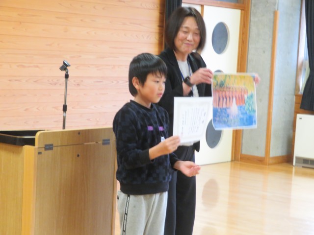 「2025絵で伝えよう!わたしの町のたからもの」の賞状授与と作品の紹介、「健康川柳」の入賞者の紹介を行いました。