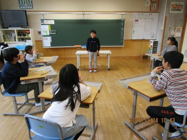 終業式後の学級活動では、「2学期にがんばったこと」や「冬休みに楽しみなこと」を紹介し合いました。