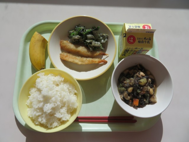 今日の献立は、ご飯、牛乳、ししゃもフライ、よごし、大豆の磯煮、バナナです。
