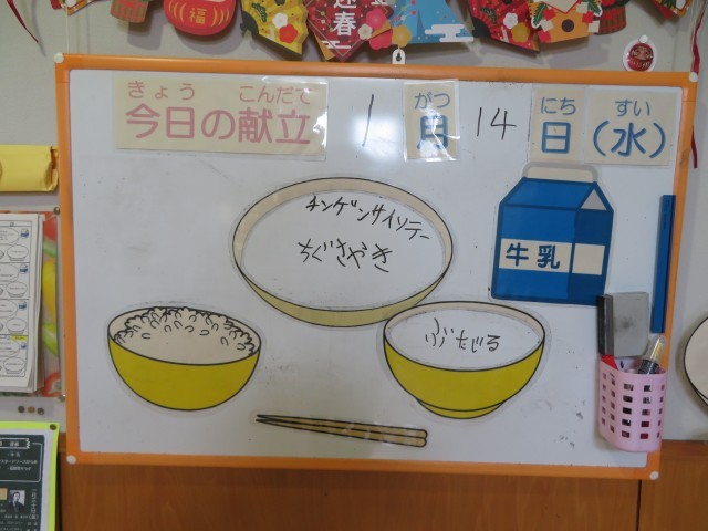 今日の献立は、菜めし、牛乳、千草焼き、チンゲンサイソテー、豚汁です。