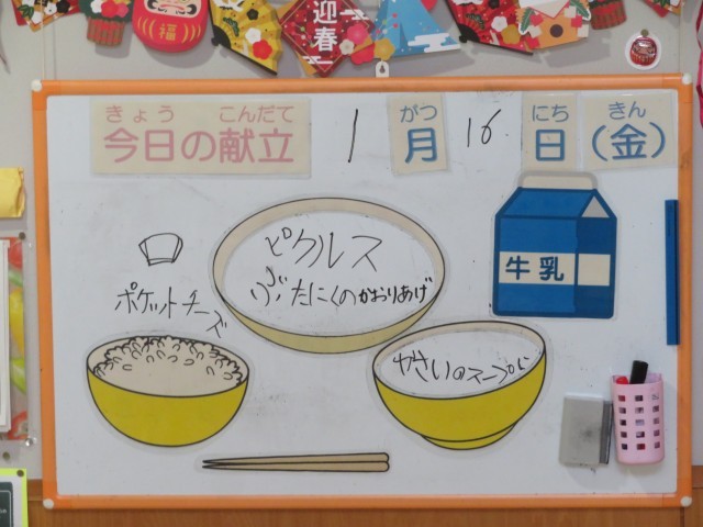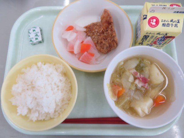 今日の献立は、ごはん、牛乳、豚肉の香り揚げ、ピクルス、野菜のスープ煮、ポケットチーズです。