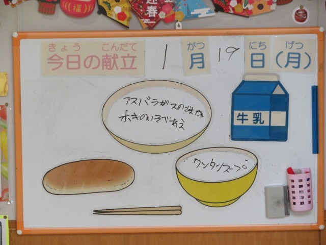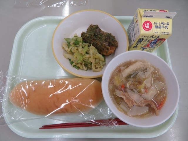 今日の献立は、コッペパン、牛乳、ホキの磯辺揚げ、アスパラガスのごまだれ、ワンタンスープです。