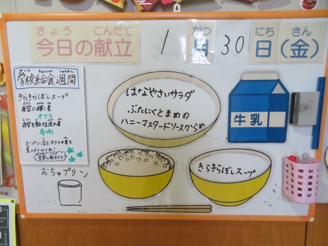 今日の献立は、ごはん、牛乳、豚肉と豆のハニーマスタードソースからめ、花野菜サラダ、きらきらぼしスープ、お茶プリンです。