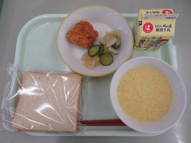 今日の献立は、食パン、牛乳、チキンフィレ、大根サラダ、かぼちゃクリームスープです。