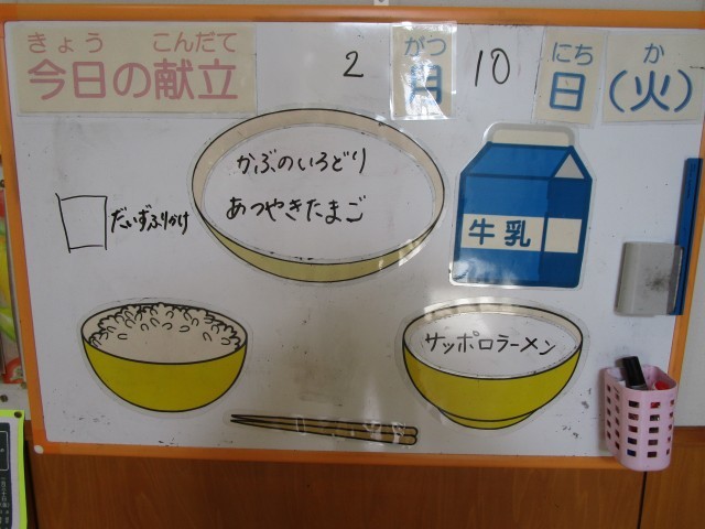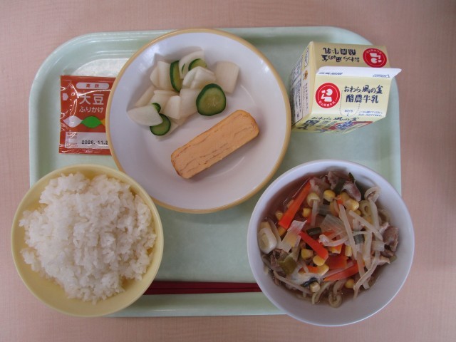 今日の献立は、ご飯、サッポロラーメン、かぶのいろどり、厚焼きたまご、大豆ふりかけ、牛乳です。