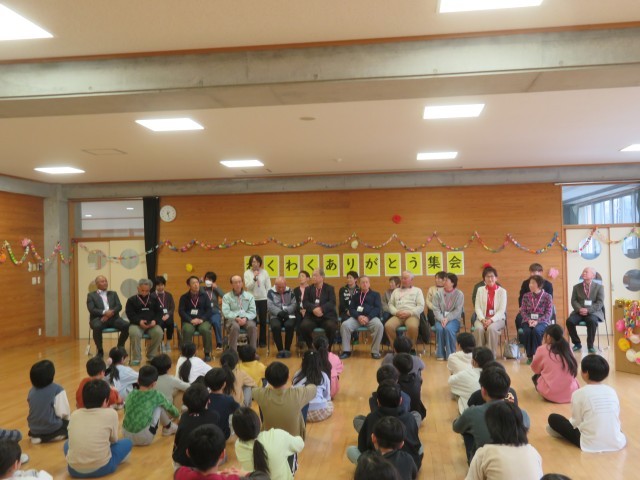 今日は、わくわく会員のみなさん、安全パトロール隊、消防団、グリーンアドベンチャー協力者、劇団ブーケのみなさんなど、地域でお世話になった方に感謝の気持ちを伝える、わくわくありがとう集会が行われました。