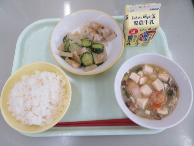 今日の献立は、ごはん、牛乳、焼きぎょうざ、華風和え、えびと豆腐のうま煮です。