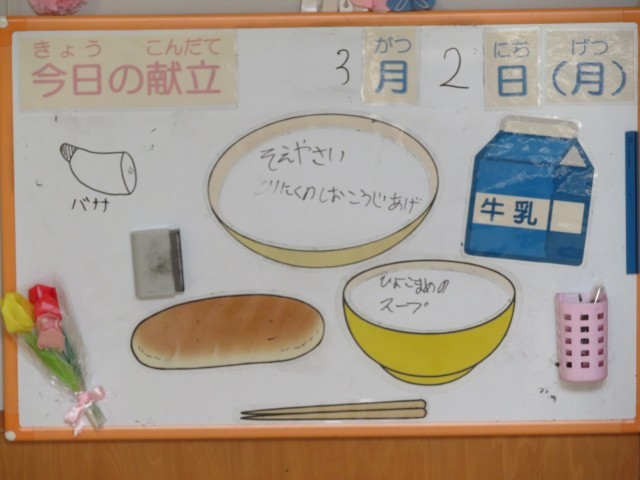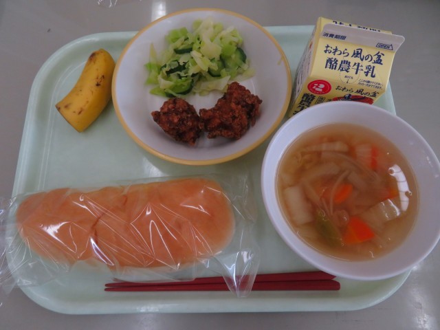 今日の献立は、コッペパン、牛乳、ひよこ豆のスープ、鶏肉の塩麴揚げ、添え野菜、バナナです。