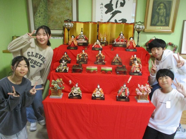 今日は3月3日、ひなまつりの日です。学校の雛人形を見る機会も今年で最後となり、記念に写真を撮りました。